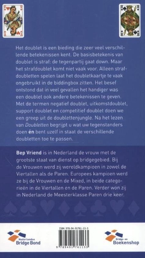 In de beginfase van het bridgespel waren alle doubletten voor straf; een doublet op bijvoorbeeld een 1-opening was dus ook voor straf. In de praktijk bleek dit niet niet praktisch. De betekenis van dit doublet werd al snel gewijzigd in een informatiedoublet. Het besef ontstond dat in veel gevallen het handiger was een doublet ook andere betekenissen te geven. Het bridgespel is daarna met de introductie van een reeks doubletten verder ge?volueerd. Met de termen negatief doublet, teruggekaatst doublet, support doublet, competitief doublet, optioneel doublet, Lightner doublet, balancing doublet doen we een greep de doublettenjungle. Na het lezen van Doubletten begrijpt u wat uw tegenstanders doen ?n bent uzelf in staat deze afspraken toe te passen.