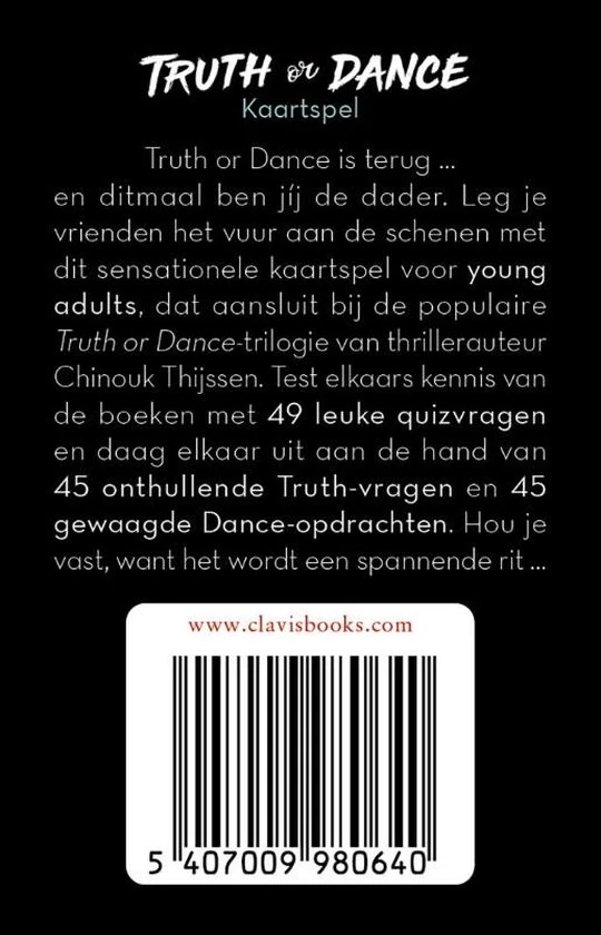 Truth or Dance is terug ? en ditmaal ben j?j de dader. Leg je vrienden het vuur aan de schenen met dit sensationele kaartspel voor young adults, dat aansluit bij de populaire Truth or Dance-trilogie van thrillerauteur Chinouk Thijssen. Test elkaars kennis van de boeken met 49 leuke quizvragen en daag elkaar uit aan de hand van 45 onthullende Truth-vragen en 45 gewaagde Dance-opdrachten. Hou je vast, want het wordt een spannende rit ?
