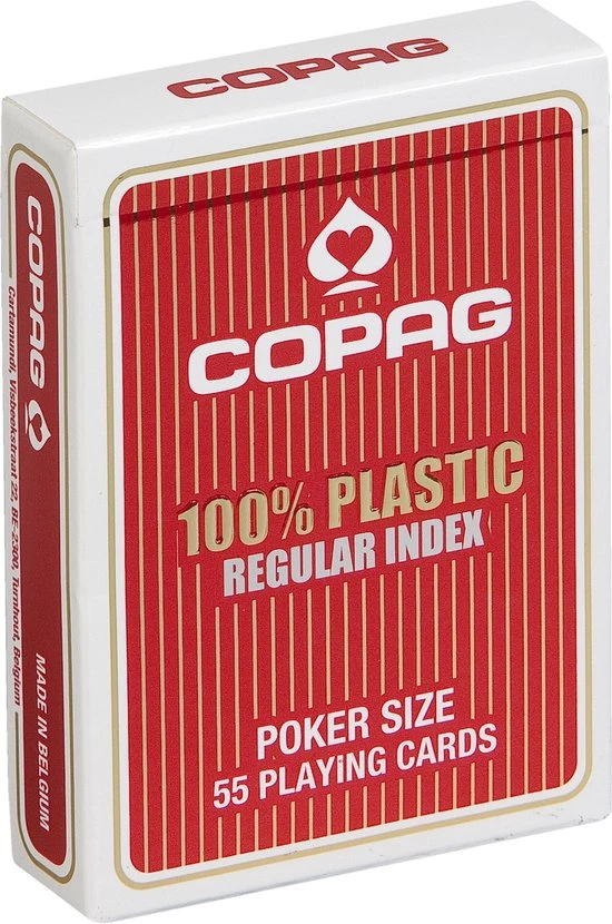 Display met 12 decks Copag regular pokerkaarten. COPAG wordt beschouwd als d? ultieme pokerkaart. Doordat deze kaarten van 100% PVC plastic zijn gemaakt, zijn ze beter bestand tegen gebruikssporen, in tegenstelling tot kartonnen speelkaarten. Probeer je een COPAG kaart te plooien, springt deze terug naar haar oorspronkelijke kaarsrechte vorm, zonder markeringen te vertonen. Praktisch dus voor pokerspelers die enkel met de peak index werken. Een COPAG kaart glijdt ook vloeiend over een pokertafel wanneer de kaarten worden gedeeld, en de kaarten shufflen gaat als vanzelf doordat ze zo mooi in elkaar schuiven. Desalniettemin hebben de COPAG kaarten een achterkant waar wat textuur in zit, zodat ze de grip ook verbeteren ? handig voor zowel de dealer als de spelers.
