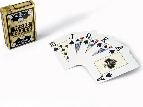 Copag Texas Hold’em Gold pokerkaarten, Deze kaarten zijn speciaal ontwikkeld naar de wensen van pokerspelers wereldwijd, daarom ligt de nadruk vooral op het symbool die op de kaart staat, de symbolen zijn extra groot en extra duidelijk weergeven zodat je in een oogopslag kunt zien welke kaart op tafel ligt.