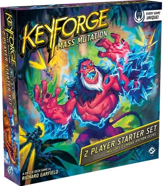 Each Mass Mutation Two-Player Starter Set contains two ready-to-play 36-card decks, bringing together three of the diverse Houses of the Crucible?each featuring their own mix of cards and unique from every other Archon Deck in existence. You?ll also find all of the tokens that you need for two players to start playing KeyForge!