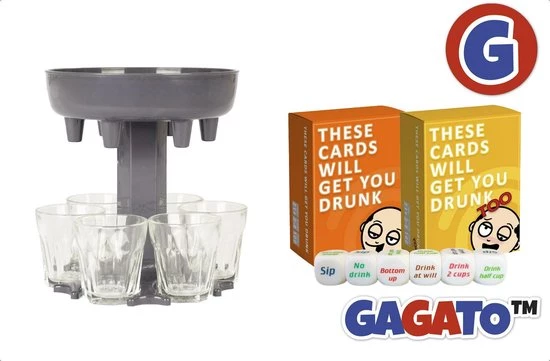 Deze set met twee kaartspellen ?n een vette shotdispenser staat garant voor een hilarische avond met je vrienden en vriendinnen! Binnen no-time vul jij zes shotglazen en serveer je ze met speels gemak naar de speeltafel.