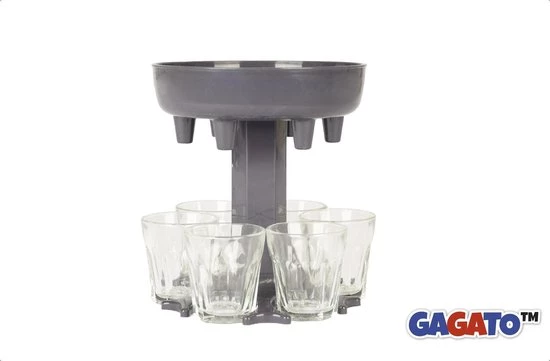 De Shot Dispenser bestaat uit 4 losse onderdelen die je gemakkelijk in elkaar zet. Wanneer je de Shot Dispenser in elkaar hebt gezet plaats je drie tot zes shotglazen in de dispenser. De gaten die je niet gebruikt, sluit je met de speciale leak-plugs af. Dan pak je je favoriete drank (tequila, rum, gold strike?) erbij en giet je deze in de fontein bovenin de dispenser. Zo vul je alle glazen tegelijk. Proost!