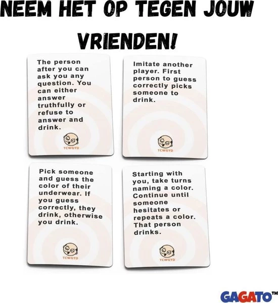 Dit is niet alleen deel ??n, maar ook deel twee uit de verrassende TCWGYD (These Cards Will Get You Drunk) serie. Een geweldig origineel spel voor een heerlijke avond plezier met je vrienden en vriendinnen. Omdat dit spel voor twee tot acht spelers is, kun je er best een shot dispenser bij gebruiken.