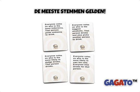 Zet maar vast wat lekker drankjes koud en bestel alvast een taxi of een Uber. De kans is aanwezig dat je na het spelen van dit spel liever niet op eigen gelegenheid naar huis gaat. Dit wordt een avond die je niet snel zult vergeten. Bereid je voor om te concurreren, te stemmen en je vrienden voor de gek te houden met de hilarische drinkspel!