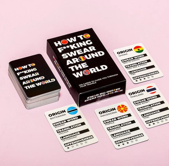 How to fucking swear around the world kaarten van Gift Republic. Kaartenset die vertelt welke scheldwoorden er in welke taal zijn. Op de kaart staat het scheldwoord, het land, de taal, de Engelse vertaling en hoe beledigend het is. In totaal zitten er 100 kaarten in de set die je leert over de grens te schelden. Perfect voor reizigers.