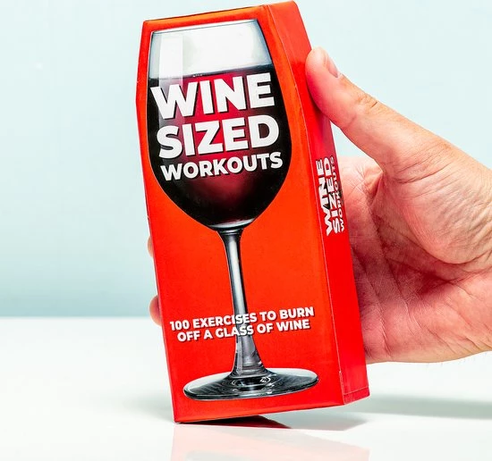 Wine sized workouts (100 oefeningen) van Gift Republic. Grappige set waarin honderd oefeningen worden gegeven waarmee je precies de calorieën van een glas wijn verbrand. Zo kun je 210 push ups doen, maar ook een uur naar een horrorfilm kijken. Grappig cadeau voor wijnliefhebbers die graag zonder schuldgevoel willen genieten.