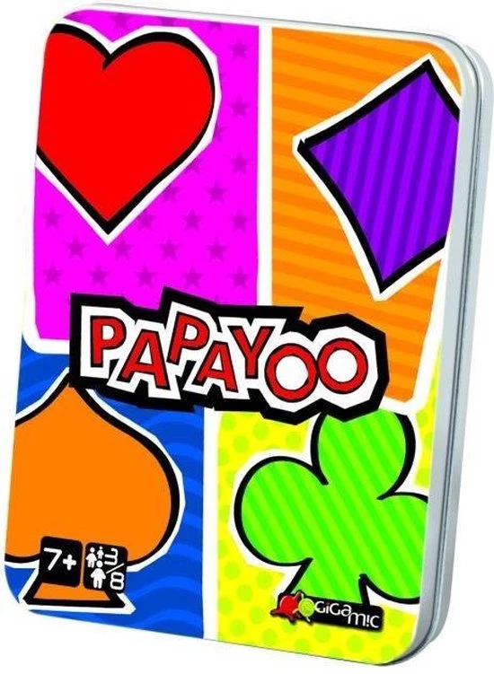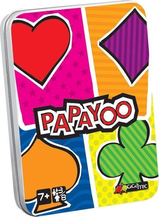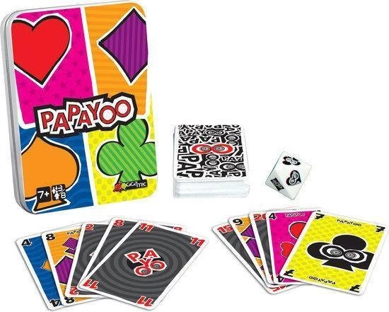 In dit spel geen boer, vrouw of aas, maar een vijfde kleur, Payoo, en een bijzondere dobbelsteen. Hoe haal ik zo… min mogelijk punten? Zorg dat je zo min mogelijk van die verdraaide Payoo’s krijgt en al helemaal geen Papayoo, die duivelse 7 waarvan de kleur bij elke partij verandert (door die al even vreselijke dobbelsteen!)…