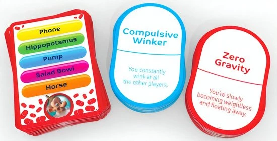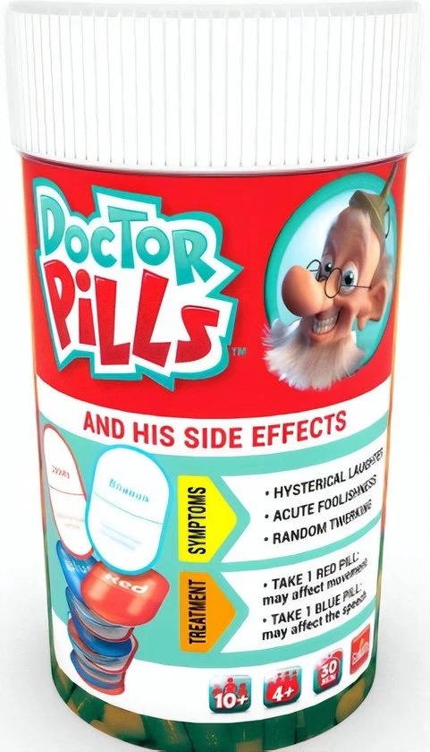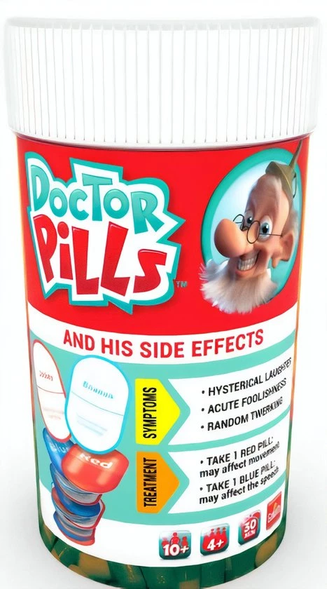 Elke speler krijgt 1 rode pillenkaart en 1 blauwe pillenkaart, waarop staat hoe diegene de gehele ronde moet praten en wat hij/zij moet doen terwijl hij speelt. Dit moet zowel bij het uitleggen, als bij het raden! Je kunt alvast raden dat het er hilarisch uitziet en klinkt als iedere speler bijwerkingen heeft!