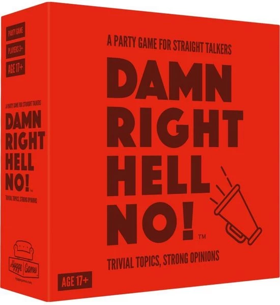 Damn right, hell no! is an entertaining game featuring more than 400 provocative, awkward, and hilarious statements that players must quickly react to. One is read out loud each round, and players hold up a Damn right! or Hell no! card to express their opinion. The blunt and politically incorrect statements will have you laughing out loud and baring your soul in no time!