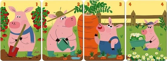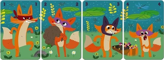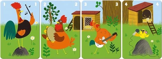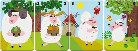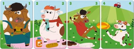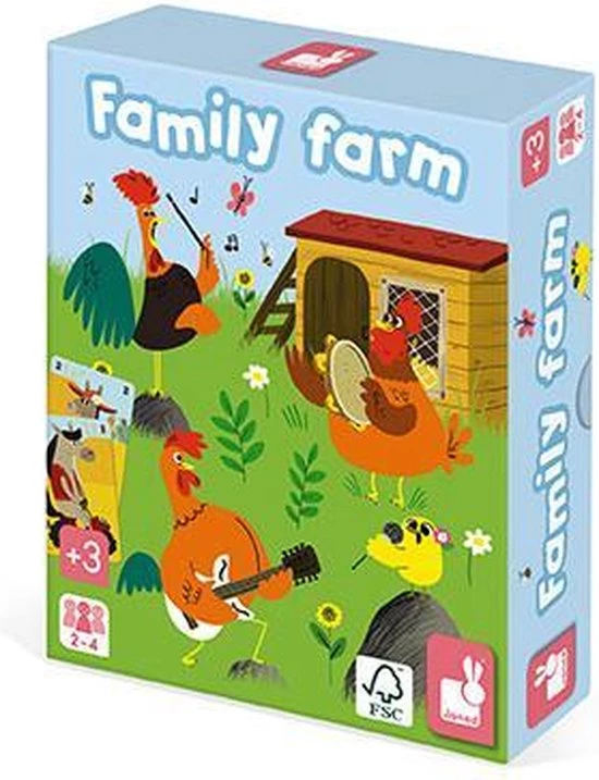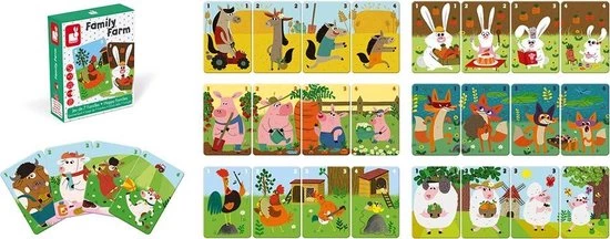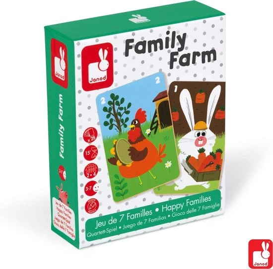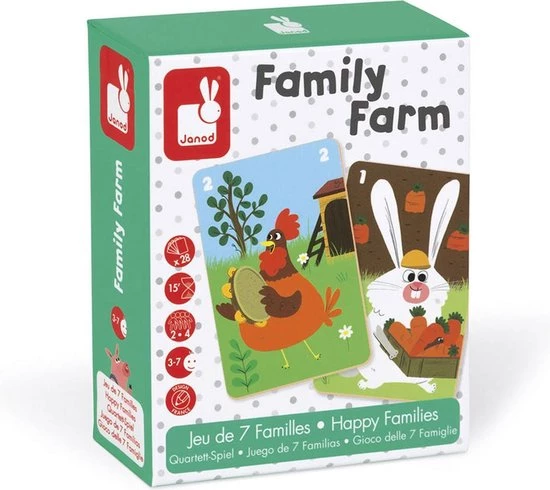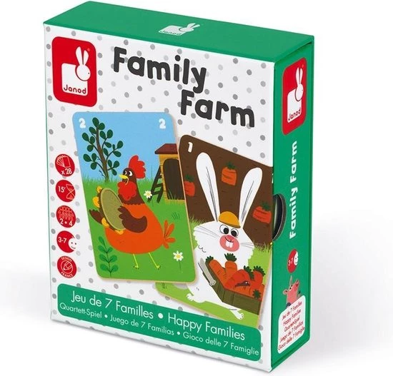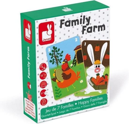 2 tot 4 spelers. 28 kaarten (7 x 10,5 cm)Maak op een leuke manier zo veel mogelijk families! Dit zijn de beschikbare dierenfamilies: schapen, konijnen, koeien, paarden, varkens, vossen en kippen. Elke familie bestaat uit 4 figuren: papa, mama, zoon en dochter.