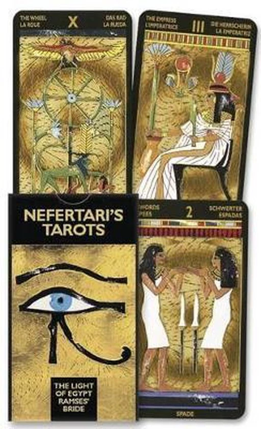 Nefertari, the bride of Ramses II, assisted her husband in the temporal ruling of Egypt. During her incredible life, she witnessed the great expansion of her country and enjoyed the worship of her devoted husband. Upon her death, Ramses built Nefertari a stunning sepulcher that remains almost intact to the present day. This deck recreates the atmosphere and symbology so loved by Nefertari?who is considered the Light of Egypt and a symbol of the most beautiful aspects of this elegant and sophisticated civilization. The typical two-dimensional Egyptian artwork is given incredible life and luminosity by the rich, patterned gold foil background. Drawing upon the fascination and mystery of Egyptian culture, Alasia has created a beautiful deck that is also practical for divinatory purposes.