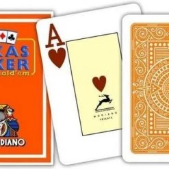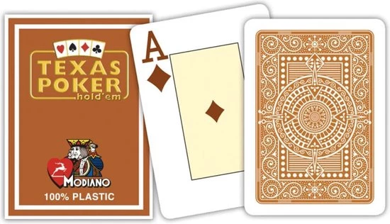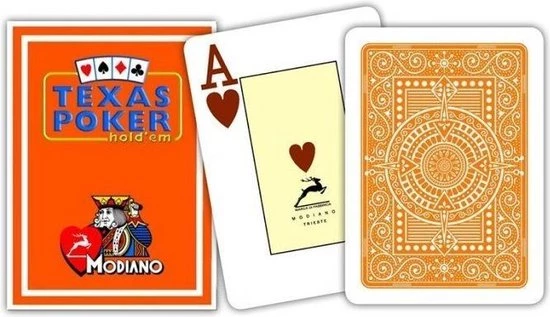 Topkwaliteit poker kaarten geproduceerd door de Italiaanse fabrikant Modiano. De plastic pokerkaarten van Modiano staan bekend om de stevigheid. Het plastic is wat dikker en steviger in vergelijking met Copag en Fournier kaarten. De kaarten zijn voorzien van jumbo symbolen in 2 hoeken van de kaart. Het binnenvlak is geel gekleurd waardoor de kaarten een wat luxere uitstraling hebben.