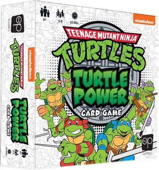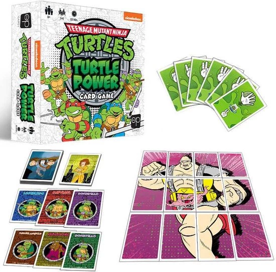 TUR-TLE-KRACHT! Activeer je favoriete misdaadbestrijdende schildpadden en red de wereld met dit epische kaartspel in steen-papier-schaar-stijl! De helden hebben jouw hulp nodig om het kwaadaardige meesterbrein Krang te trainen en te verslaan. Activeer hun sterke punten door handen van 0-5 te tonen en rondes van Rochambeau te winnen. Alleen dan kunnen de Teenage Mutant Ninja Turtles zich verenigen voor een laatste confrontatie met de gemuteerde baas!