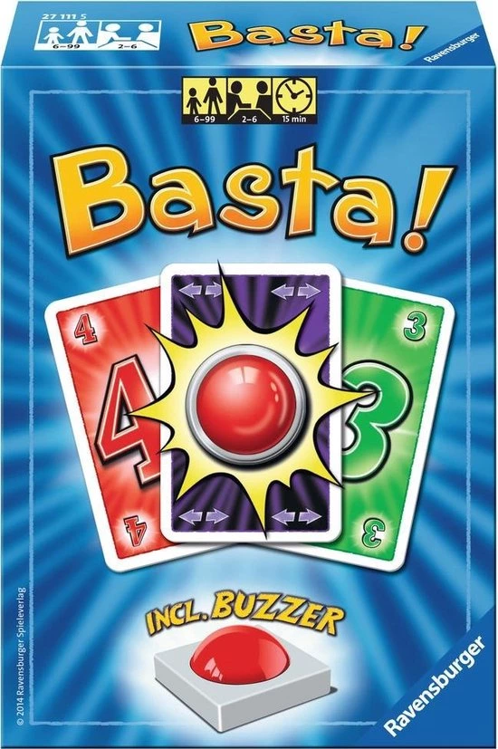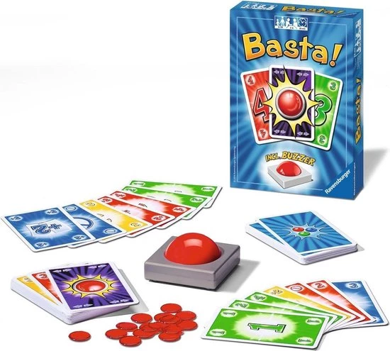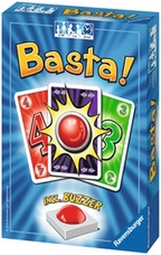 In dit klassieke kaartspel met een nieuwe draai worden niet alleen maar passende kaarten op elkaar afgelegd, maar wordt ook vlijtig gebuzzd. Ravensburger Basta! kaartspel