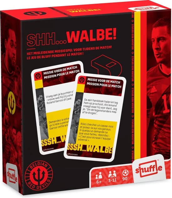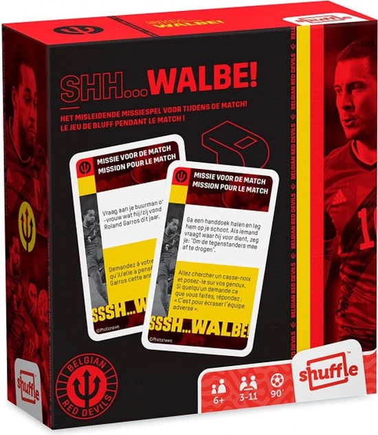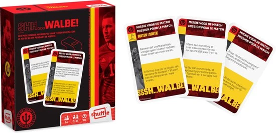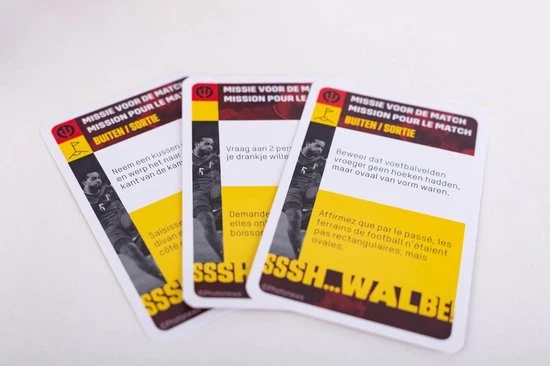 Shhh…walbe est un jeu de missions secr?tes qui ajoutera un brin de folie ? n’mporte quel match des Diables Rouges. Payez-vous la t?te de vos amis ? l’aide des cartes dans votre main. Vous vous ?tes fait d?marquez par un joueur qui a cri? “Shhh…wale”? Alors vous avez ?chou?. Mais vous pouvez r?essayer, jusqu’? ce que vous arriviez ? court de cartes. Une fous vos cartes ?puis?es, direction le banc de touche. Celui qui a marqu? le plus de points ? la fin du match est sacr? Champion de Shhh…walbe.