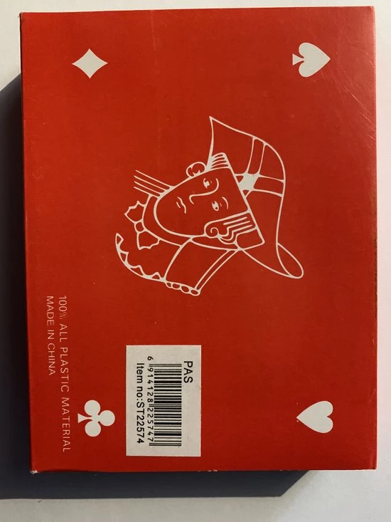 | Verpakkingsinhoud | 1, Stuks, set, van, 2, Stok, Kaarten, 1, met, rode, achterkant, en, 1, met, zwarte, achterkant |